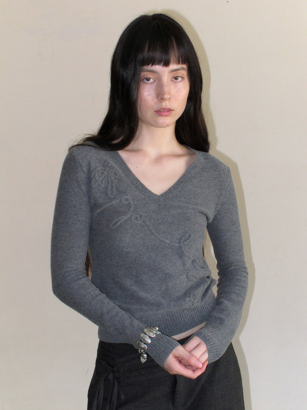 Embroidered Bow Sweater - Grey