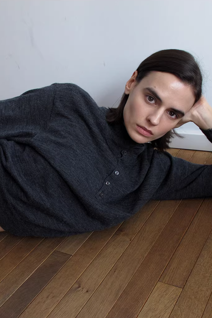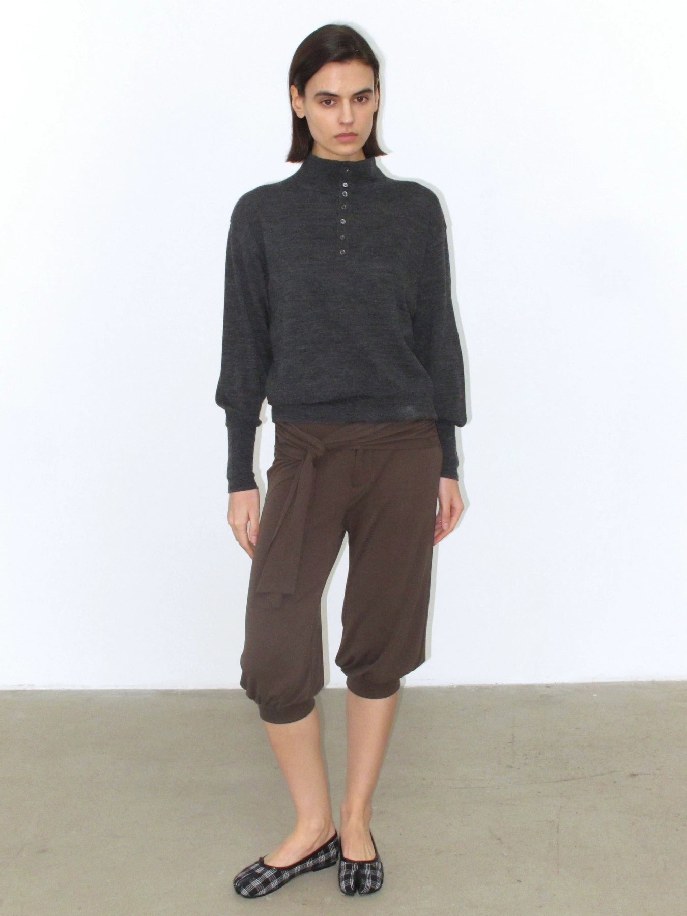 • Loose high neck with buttons
